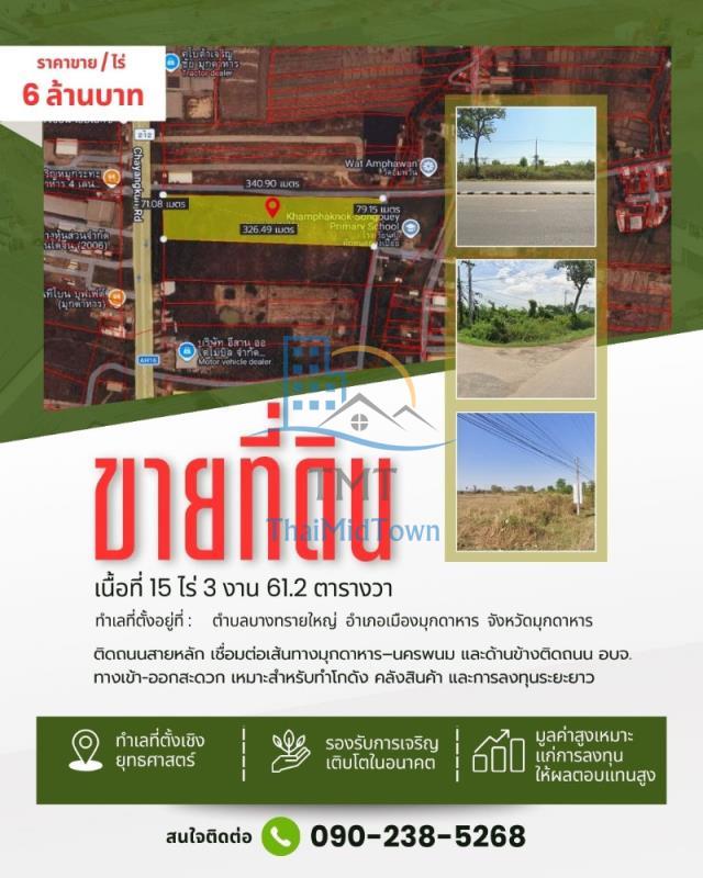 -ขายที่ดินทำเลสวย 15 ไร่ 3 งาน 61.2 ตารางวา จังหวัดมุกดาหาร ที่ตั้ง : ตำบลบางทรายใหญ่ อำเภอเมืองมุกดาหาร จังหวัดมุกดาหาร 16.59285660,104.72163611 เ ซอย- ถนน- ต.ดงหมู อ.หว้านใหญ่ มุกดาหาร